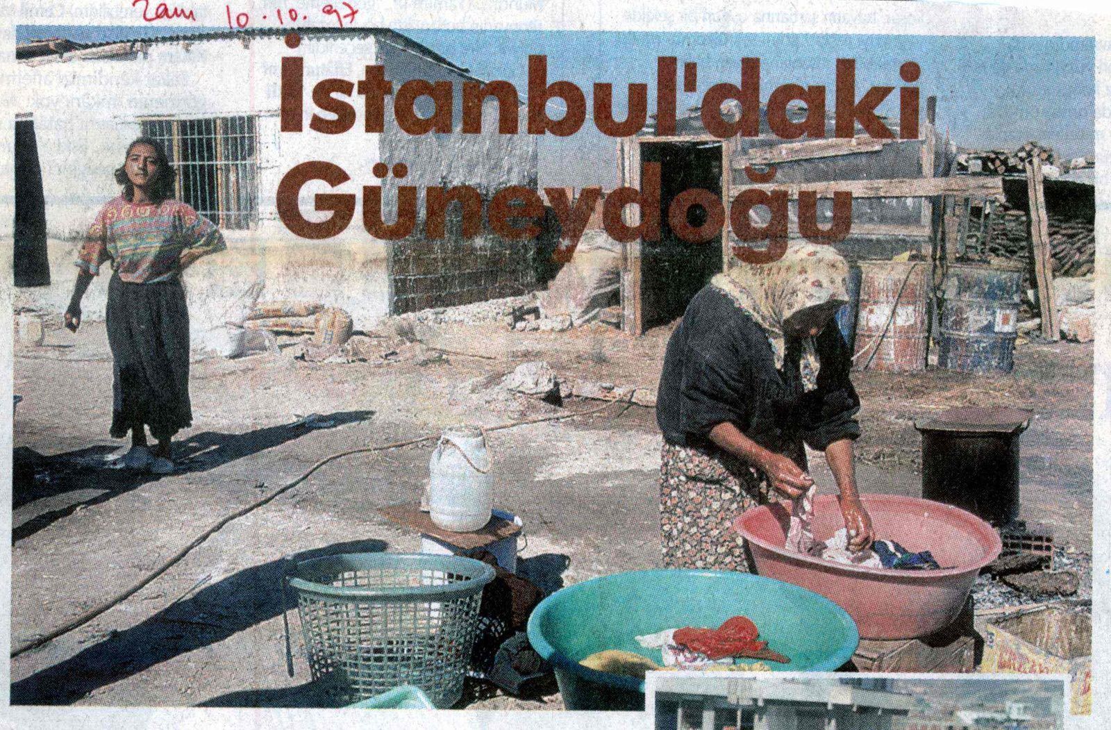 La réponse venait en page intérieure : ce village est Istanbul. « Le sud-est est à Istanbul », affirmait un titre de Zaman en octobre 1997. Sur l'une des photos de l'article, une femme en fichu et en tenue de paysanne fait la lessive dans des bassines en plastique, sur un fourneau de plein air ; sa maison est un simple cube d'agglos, recouvert de tôles ondulées ; à côté, une cabane rudimentaire faite de bâches de nylon tendues sur des planches, un abri pour le bois, et deux barils pour l'eau. Sur une autre photo, des gamines transportent des sacs, sur fond de petits immeubles en construction, dans un paysage sans végétation, sans urbanisme ni voirie. C'est l'autre visage d'Istanbul : « Nous n’attendions pas grand chose de notre vie ici. Ou bien nous mourions à cause de la guerre (terör), ou bien nous partions. Le soir, nos enfants tremblent de froid. L’hiver, nous ne trouvons rien pour nous chauffer, sauf du papier ou de petits bouts de bois que les enfants rapportent en rentrant de l’école. »