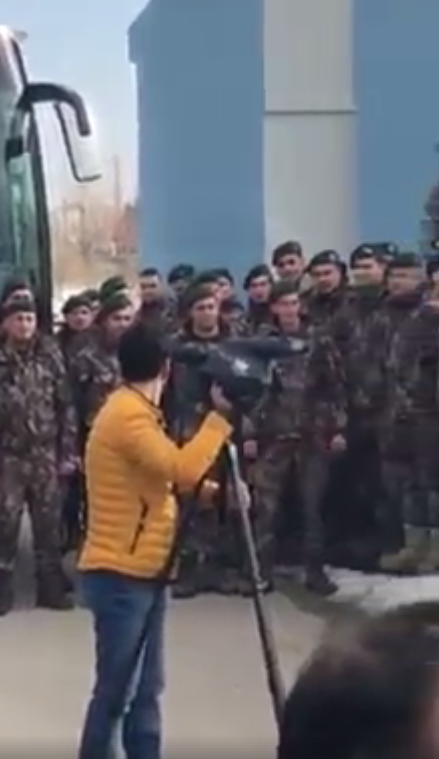 A la droite du vidéaste, un officier, tête découverte et sans galons, s'adresse à ses hommes, micro à la main. Derrière lui, des engins blindés dont le capot est recouvert d'un drapeau ; d'autres militaires d'âge mûr, probablement officiers, et des civils à l'air sévère, semblent surveiller la scène et l'assistance. Les hommes des commandos sont en treillis militaire, debout, les mains derrière le dos, coiffés d'un béret vert, ce qui les désigne comme étant des gendarmes des JÖH. A gauche de la scène attendent les autobus qui mèneront les « héros » au front.