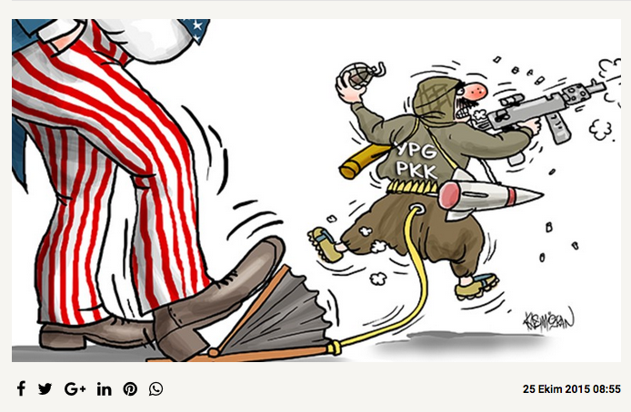 Caricatures de Kasım Özkan parues dans le quotidien Diriliş Postası, 25 octobre 2015 et 18 février 2018