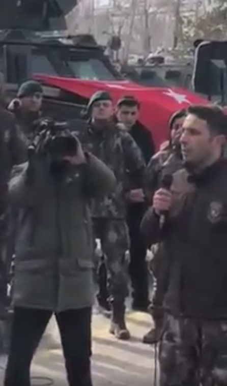 Prestation de serment des PÖH avant leur départ pour Afrin. En bas de l'écran à droite, le symbole du Loup Gris, symbole du parti fascisant MHP. Lieu non précisé. Capture d'écran sur la chaîne Polis Özel Harekat sur youtube