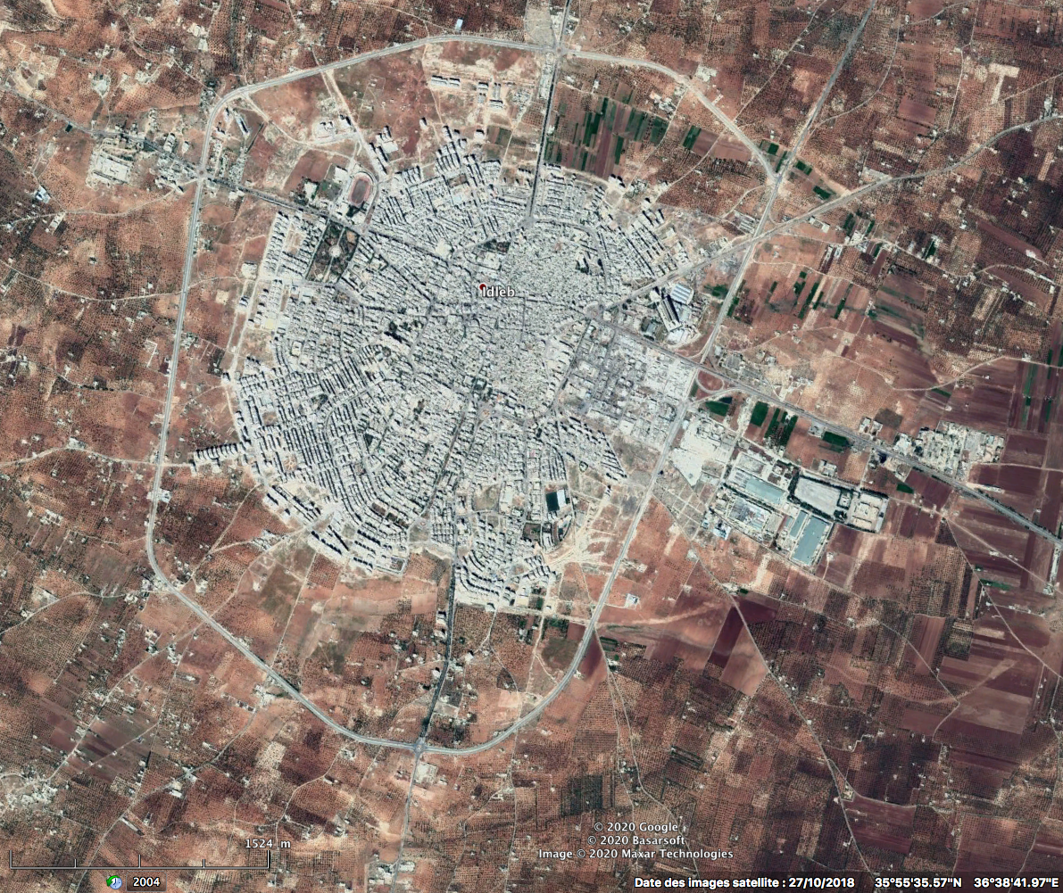 Vue satellitaire d'Idlib, au centre d'une riche région agricole. A droite, le centre-ville (cliquer pour agrandir)